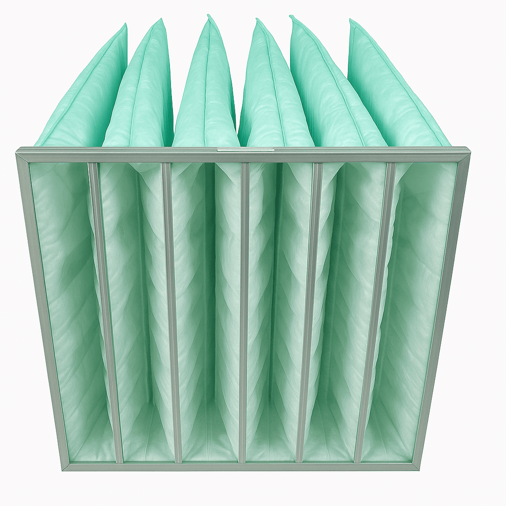 Fiberglass media filters for efficient capture of paint overspray in spray booth exhaust.